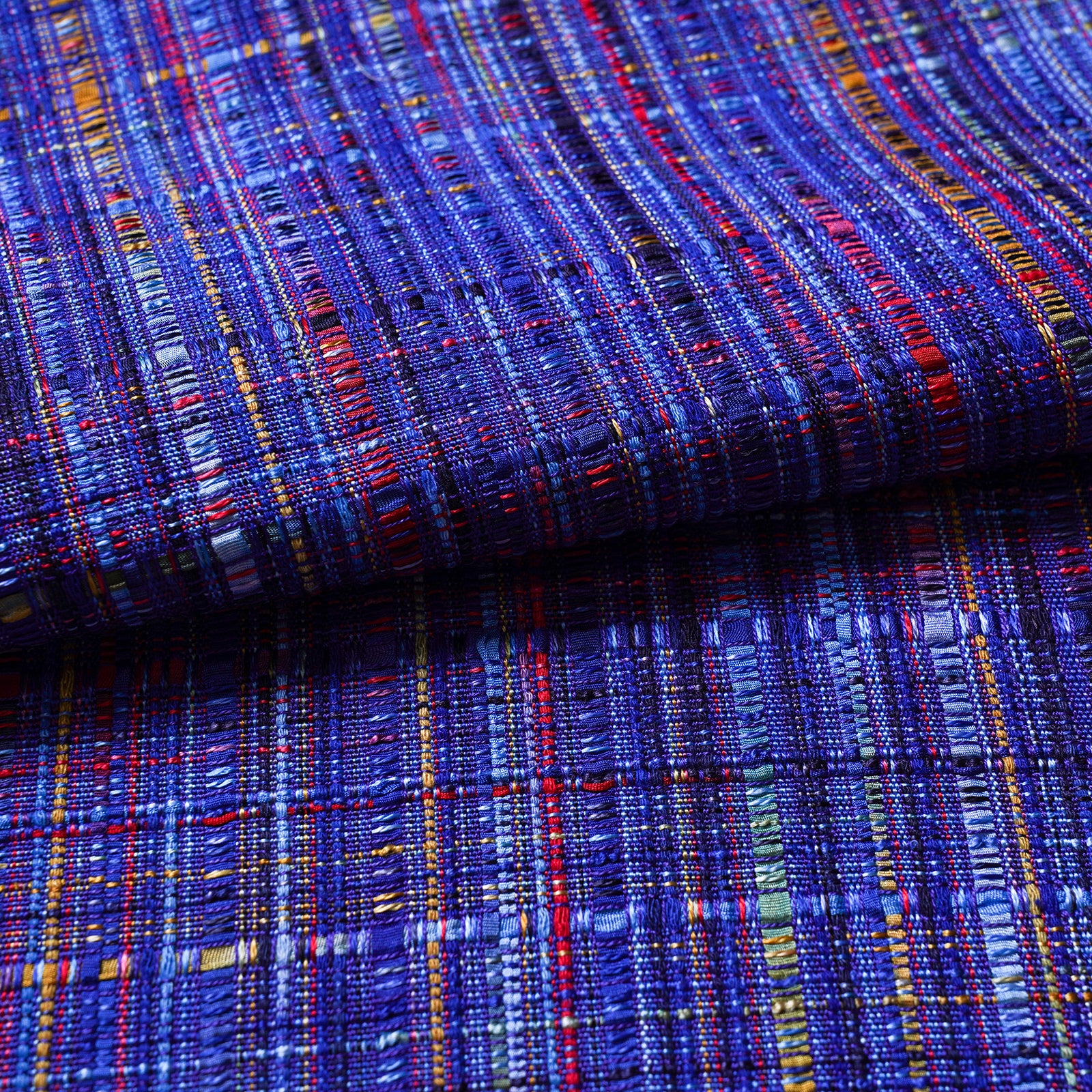 タテヨコ共にリボン糸を含め4種類の絹糸を使用し手織りで織り上げた生地です